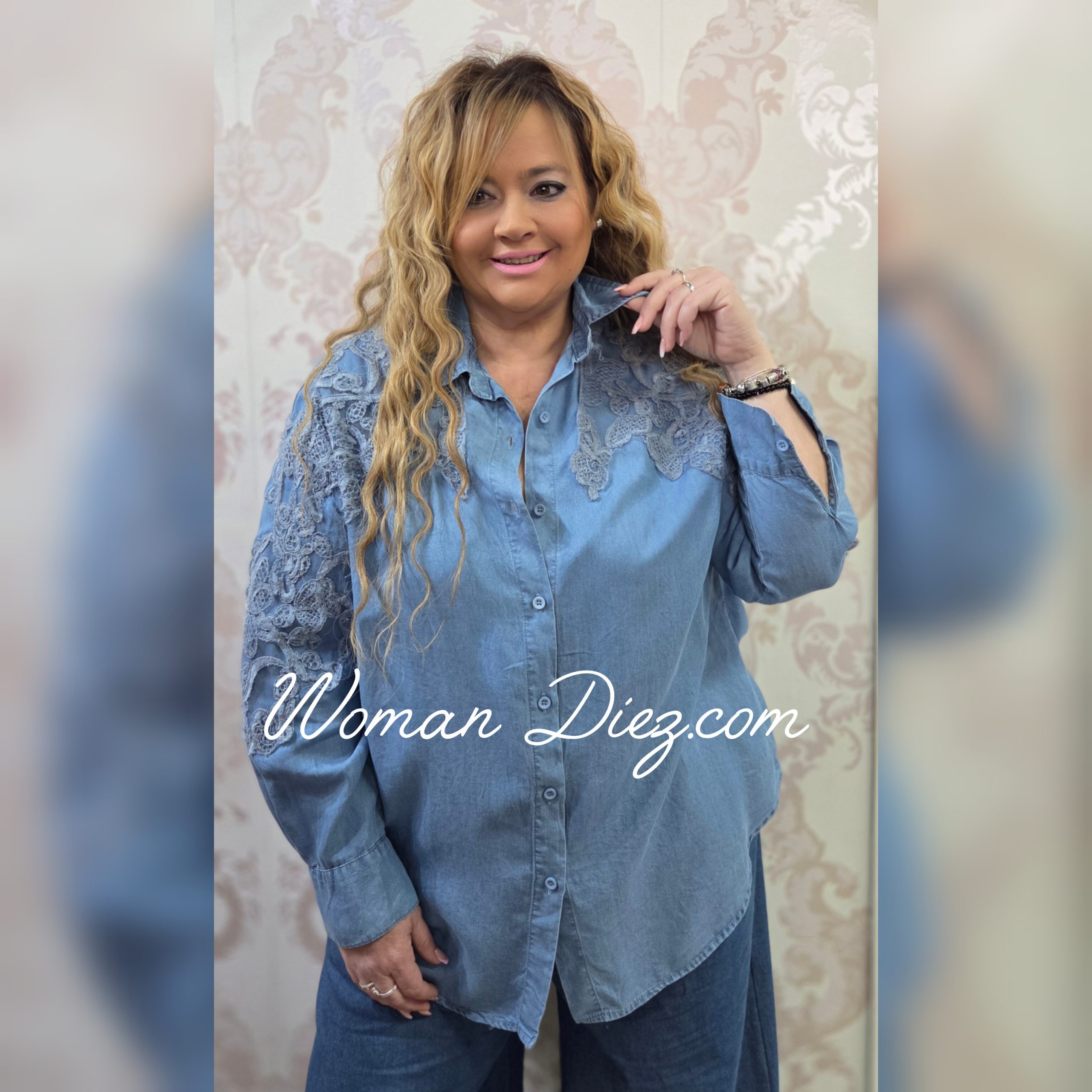 Camisa vaquera azul con encaje en la zona de los hombros, un poco mas larga por detrás que por delante, talla curvy. Ideal para combinar con un pantalón blanco cerrada o como sobre camisa.