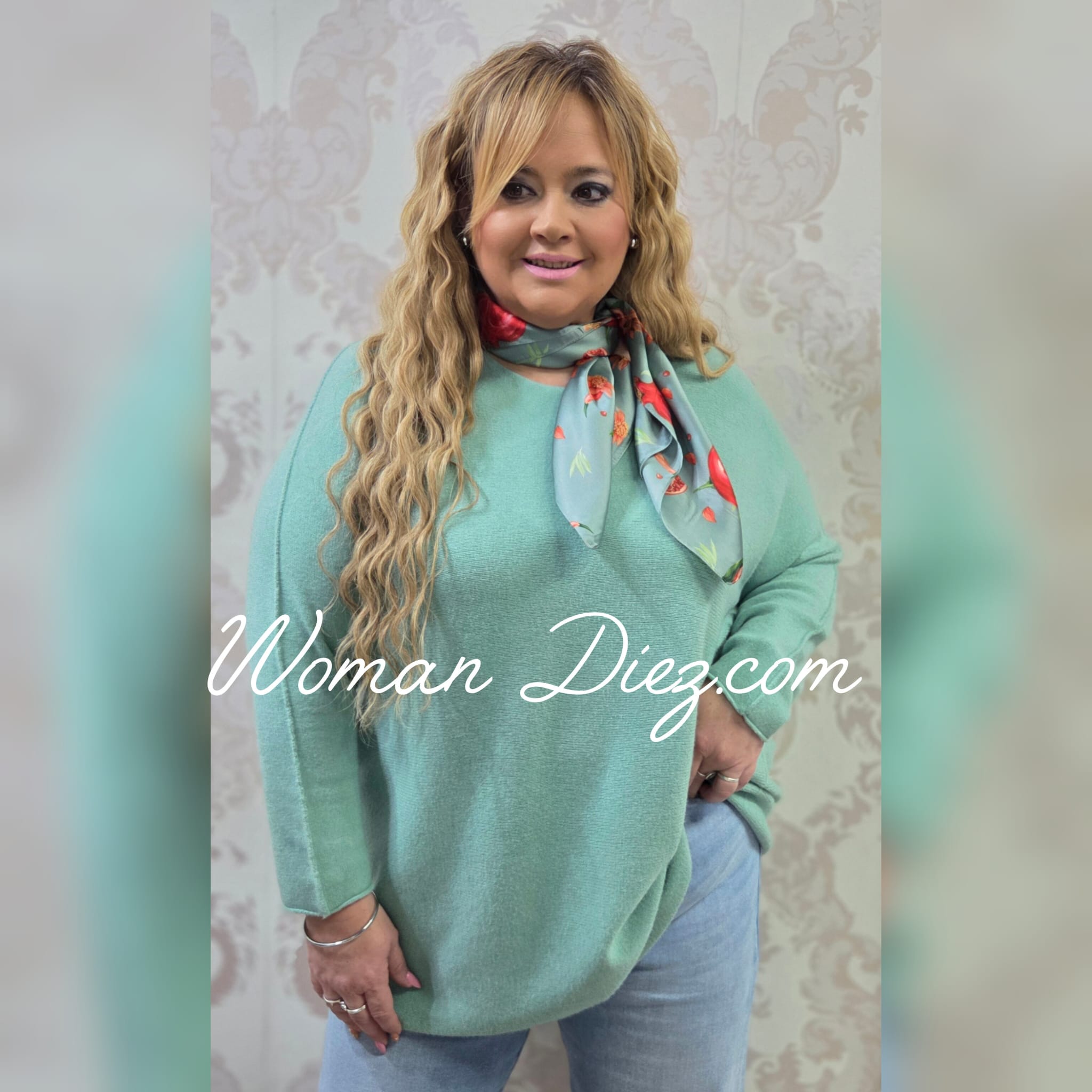 Jersey Verde Agua con tejido primaveral, ideal para el entretiempo y combinar con una camisa debajo, talla curvy.